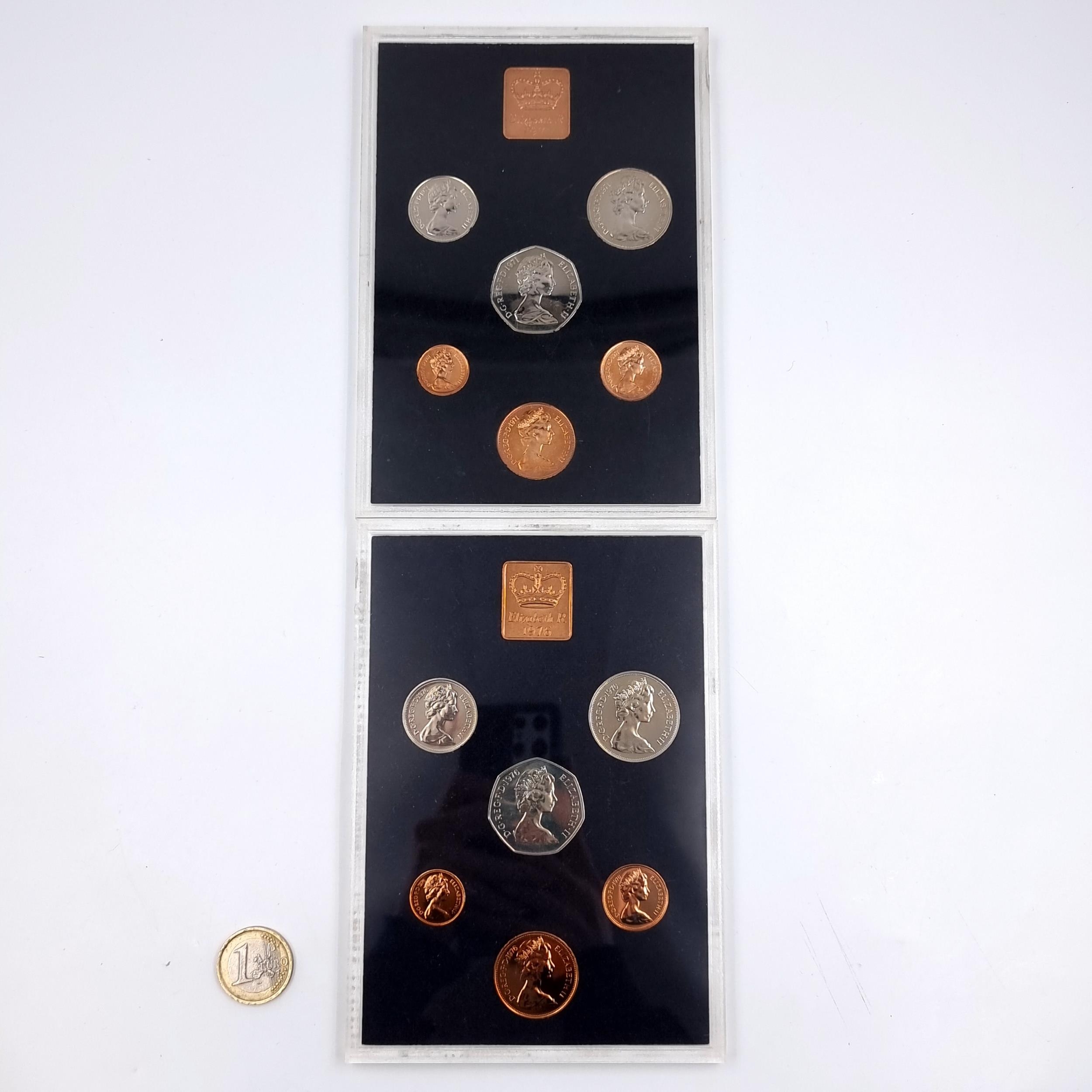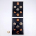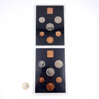 A 1970 encapsulated uncirculated presentation case of pre decimalized UK coinage, and a 1979 presentation case of decimalized coinage.