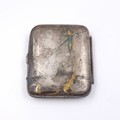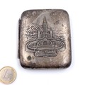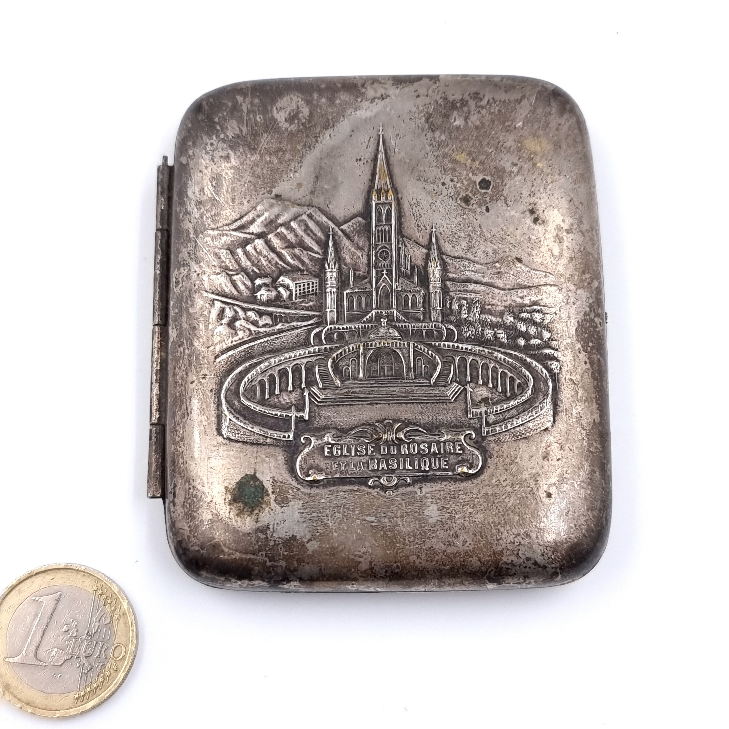 A vintage white metal cigarette case with a Lourdes impressed frontage.