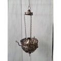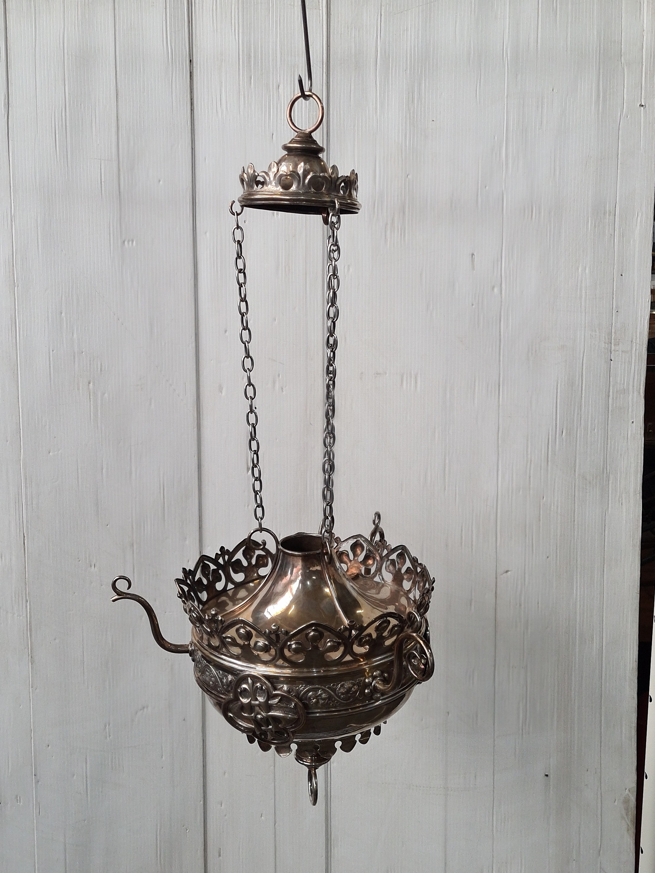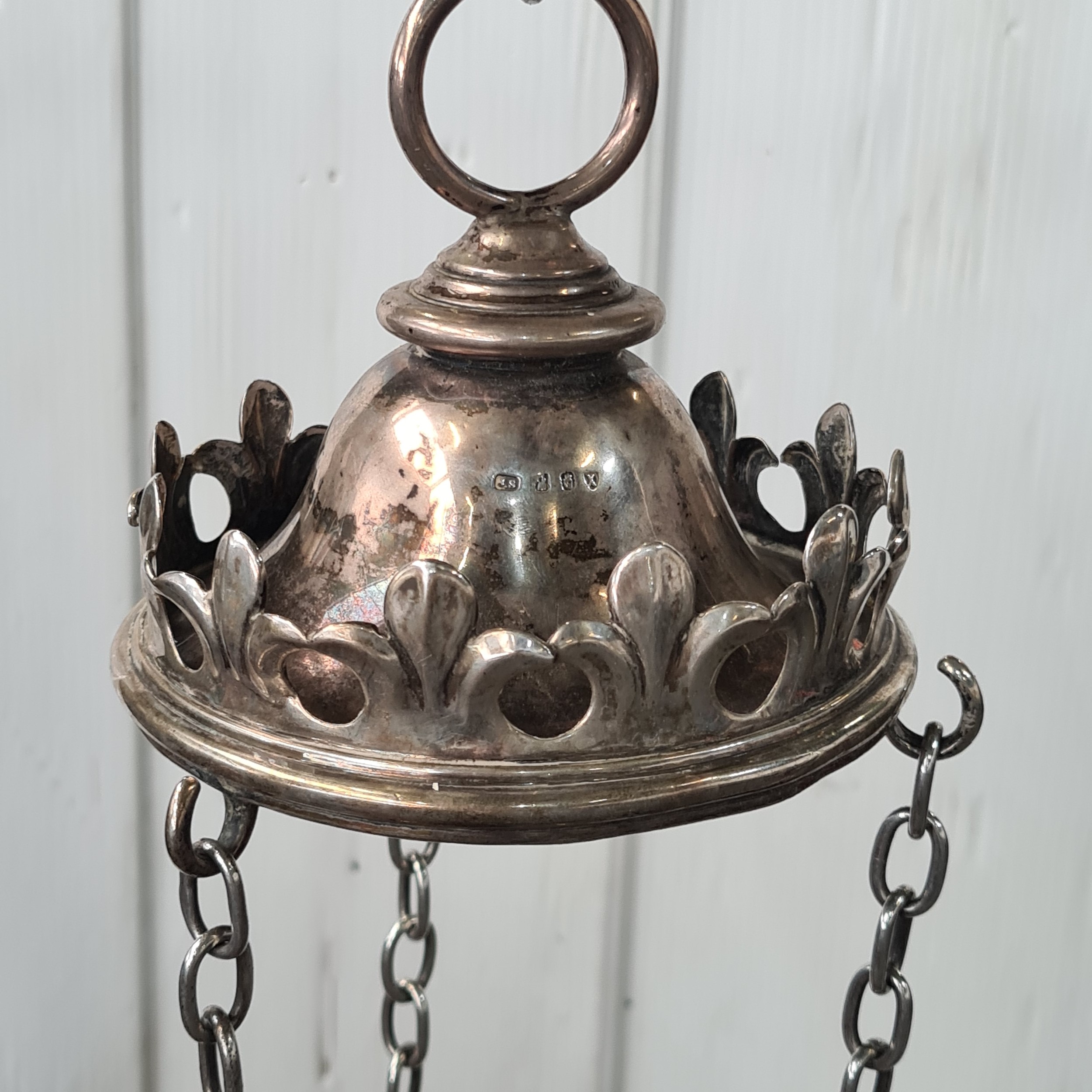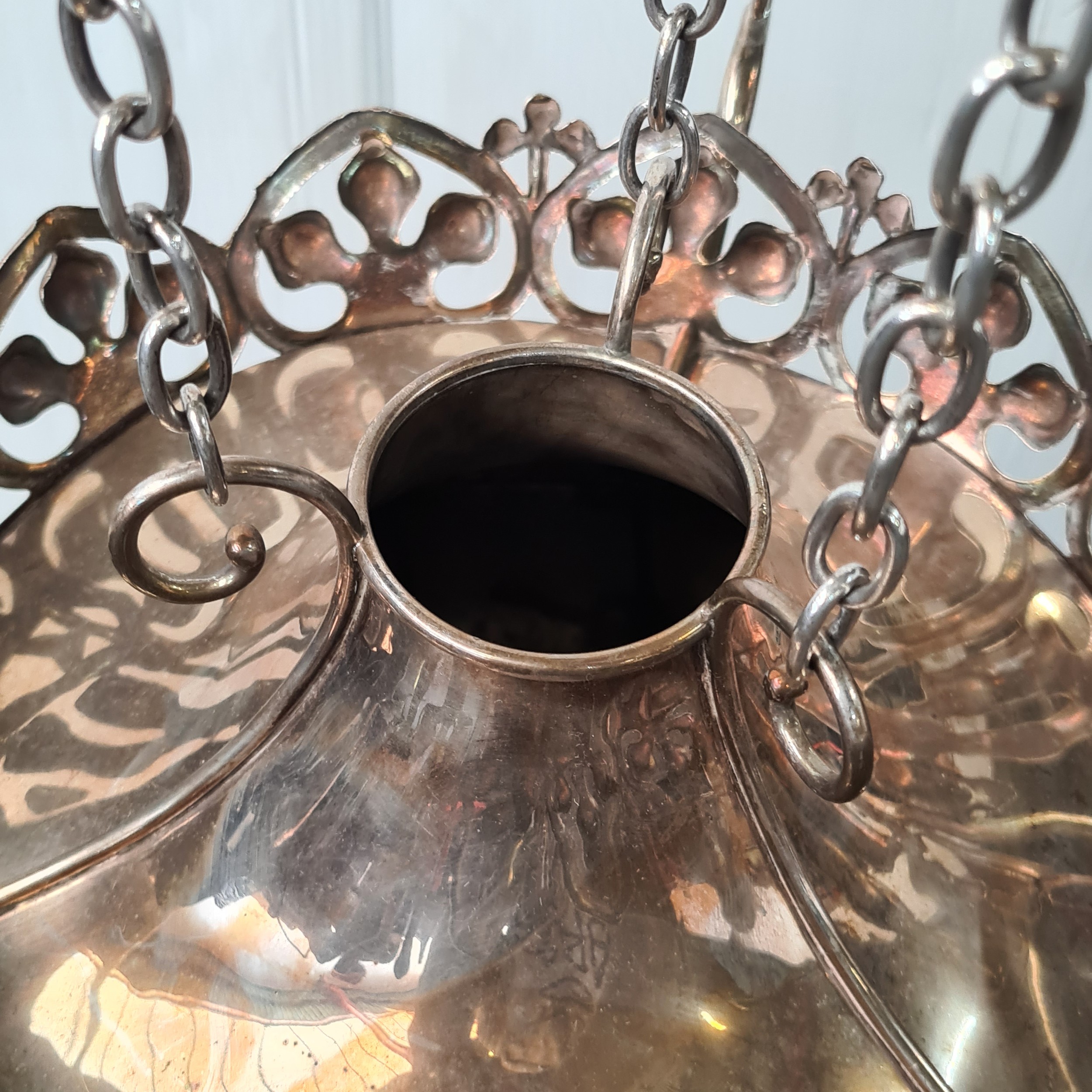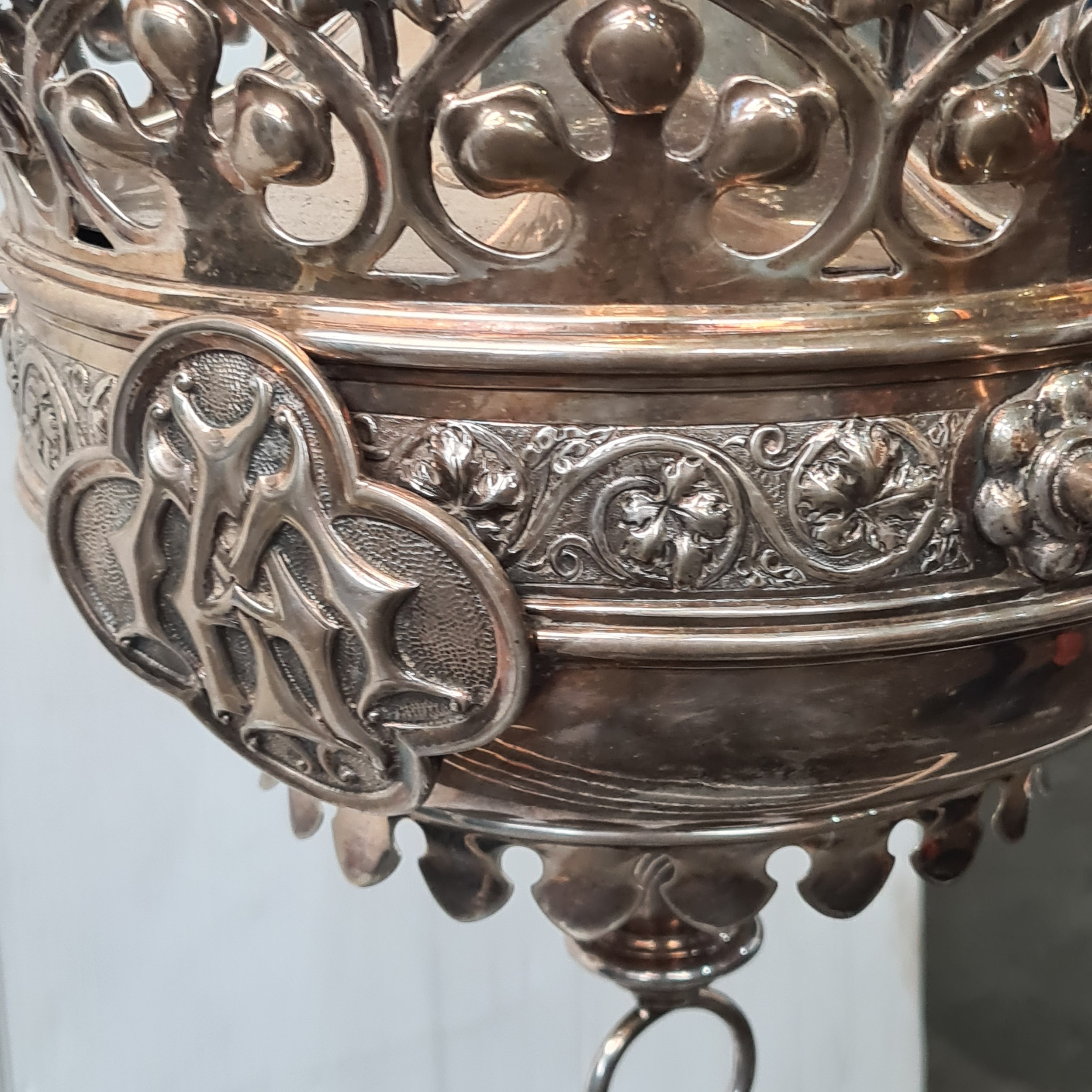 Super Star Lot: An exceptional antique Irish silver substantial religious sanctuary lamp, masterfully crafted by silversmith John Smyth in Dublin, dated 1893, with good clear hallmarks. This lamp is embellished with intricate engravings and embossed designs, featuring ornate floral and scroll motifs. The upper rim is adorned with a scalloped edge and pierced detailing, allowing light to emanate while protecting the flame. A prominent central monogram, likely "IHS" (a Christian symbol derived from the first three letters of the Greek name for Jesus, ΙΗΣΟΥΣ (Iēsous)). Complete with its original three Irish silver chains. An incredibly rare piece. Irish Silver total weight 3830 Grams. Best Irish Silver piece we have seen. Its so special it should attract International Interest. From the fabulous Nullamore house in Miltown Dublin. (slight loss to one of the arms, just missing a little scroll work.)