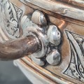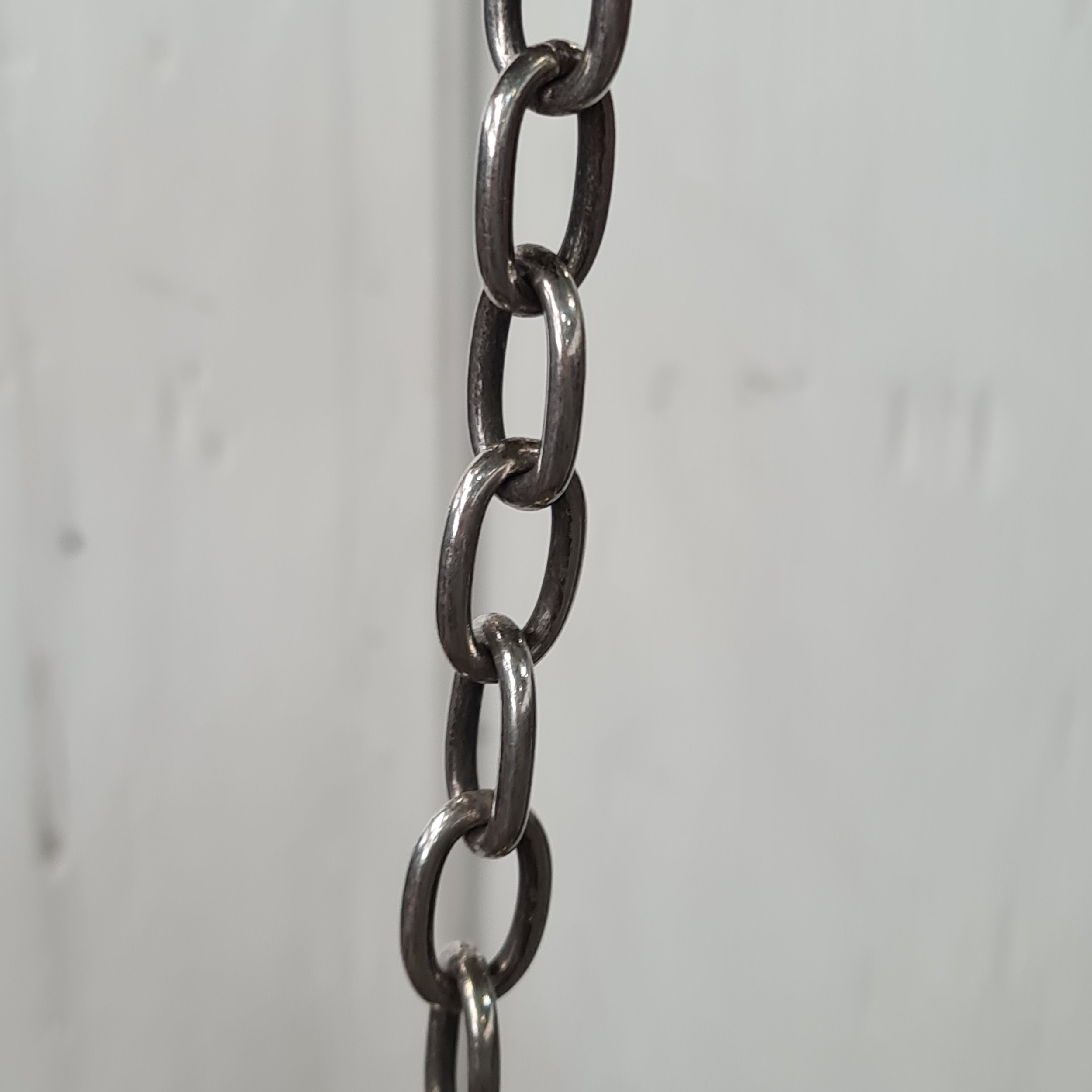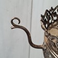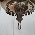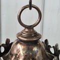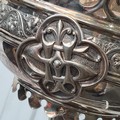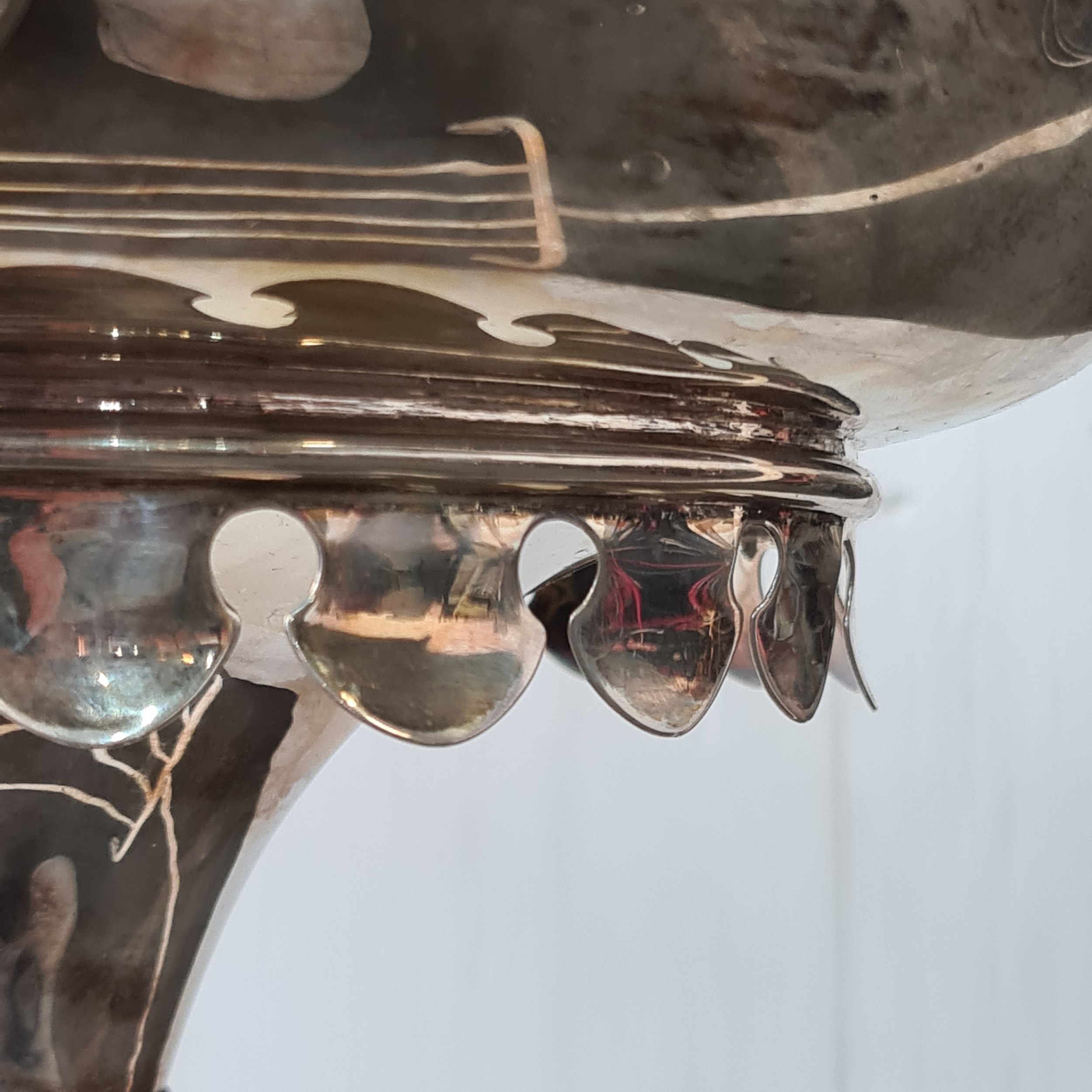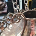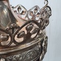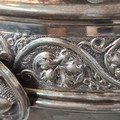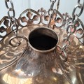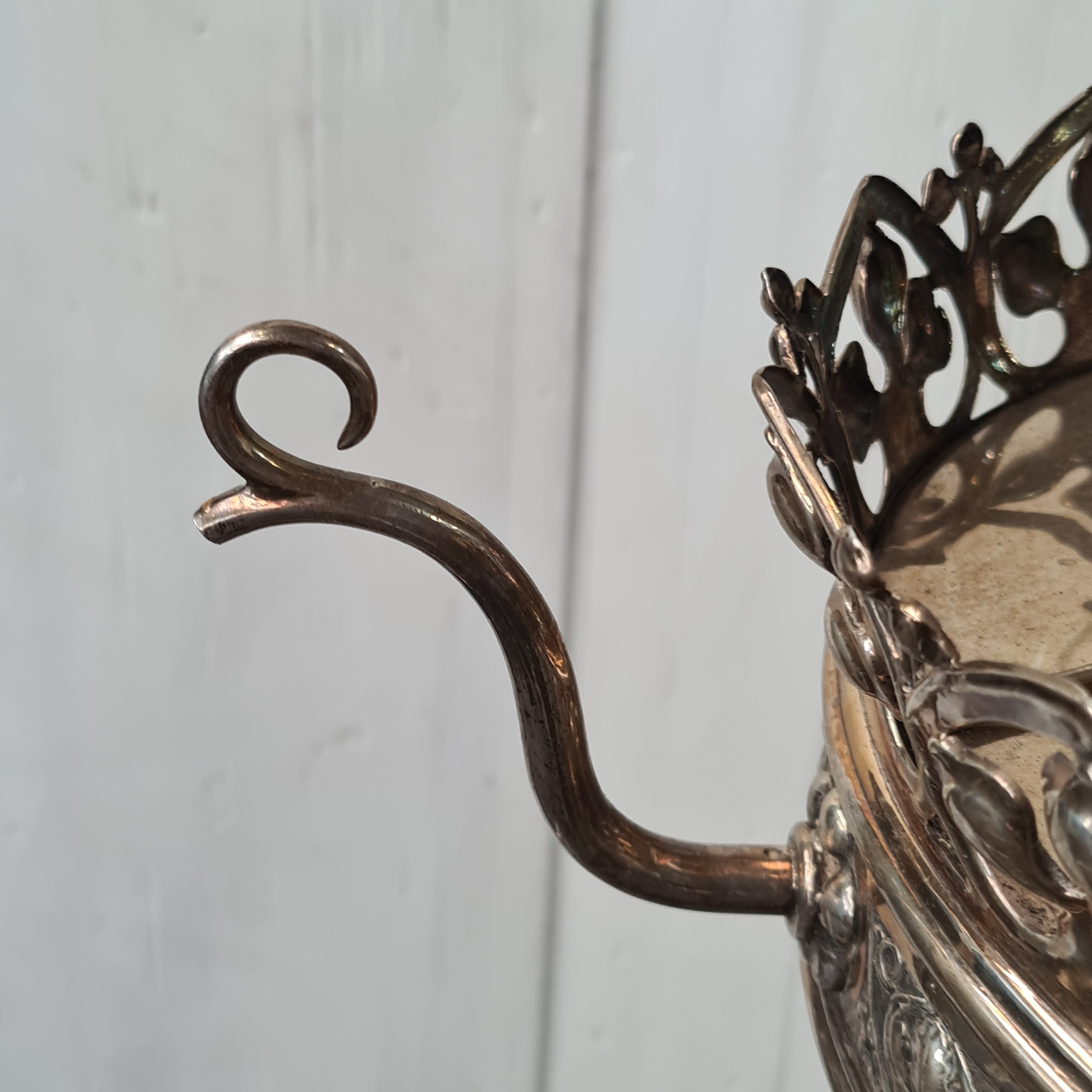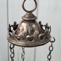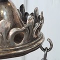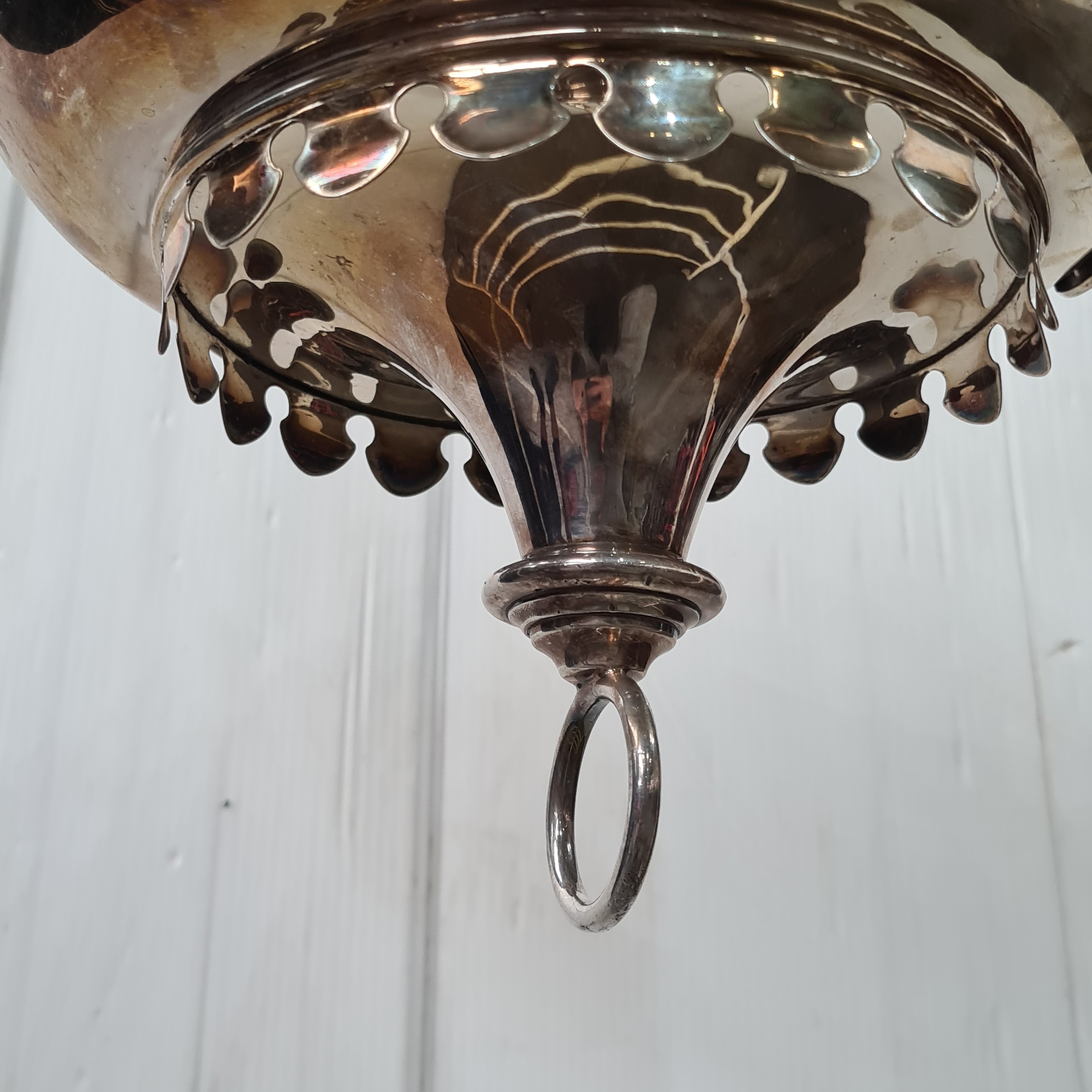 Super Star Lot: An exceptional antique Irish silver substantial religious sanctuary lamp, masterfully crafted by silversmith John Smyth in Dublin, dated 1893, with good clear hallmarks. This lamp is embellished with intricate engravings and embossed designs, featuring ornate floral and scroll motifs. The upper rim is adorned with a scalloped edge and pierced detailing, allowing light to emanate while protecting the flame. A prominent central monogram, likely "IHS" (a Christian symbol derived from the first three letters of the Greek name for Jesus, ΙΗΣΟΥΣ (Iēsous)). Complete with its original three Irish silver chains. An incredibly rare piece. Irish Silver total weight 3830 Grams. Best Irish Silver piece we have seen. Its so special it should attract International Interest. From the fabulous Nullamore house in Miltown Dublin. (slight loss to one of the arms, just missing a little scroll work.)