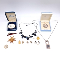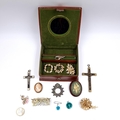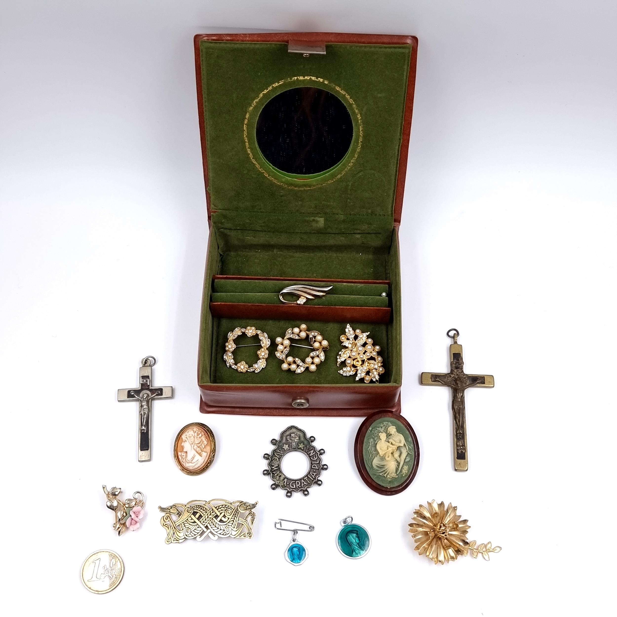 A collection of assorted jewellery including brooches, large crucifix cross pendants etc. Contained in a floral jewellery box.